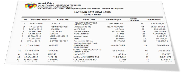 Anda bisa dengan mudah melihat obat apa saja yang laris di apotek anda, sehingga anda hanya akan menjual obat yang benar-benar laku di apotek