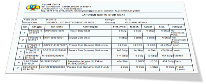 Setiap obat yang keluar masuk akan tercatat otomatis di kartu stok, jadi anda bisa dengan mudah melacak obat yang anda punya. Tanpa harus mencatat di kartu stok manual lagi.