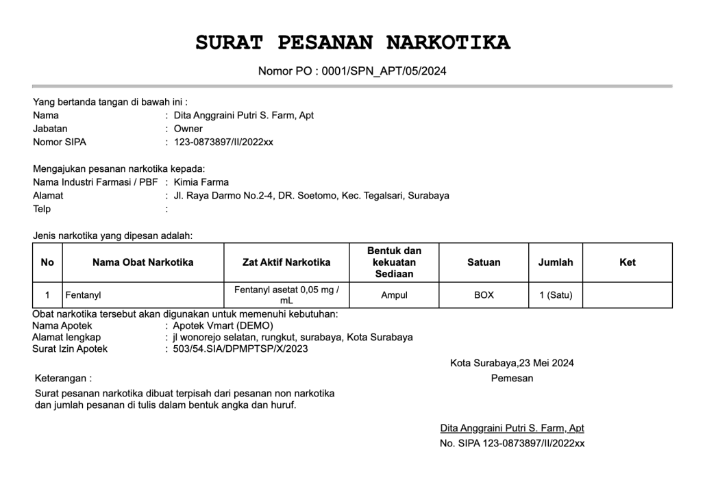 Surat Pesanan Obat adalah dokumen resmi yang dibuat oleh apotek untuk memesan sediaan farmasi, alat kesehatan, dan bahan medis habis pakai dari pemasok atau Pedagang Besar Farmasi (PBF). Surat ini berfungsi sebagai bukti tertulis atas permintaan pengadaan obat dan memastikan bahwa proses pengadaan berjalan sesuai dengan ketentuan yang berlaku.