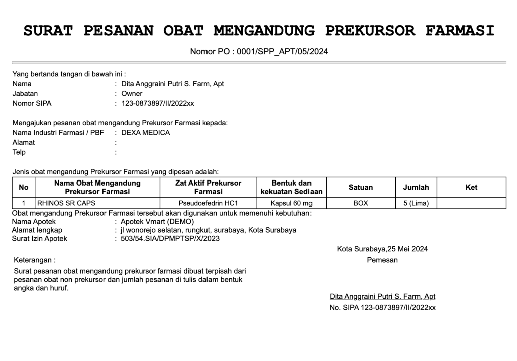 - Identitas PBF: Mencantumkan nama lengkap dan alamat lengkap PBF tujuan pemesanan.