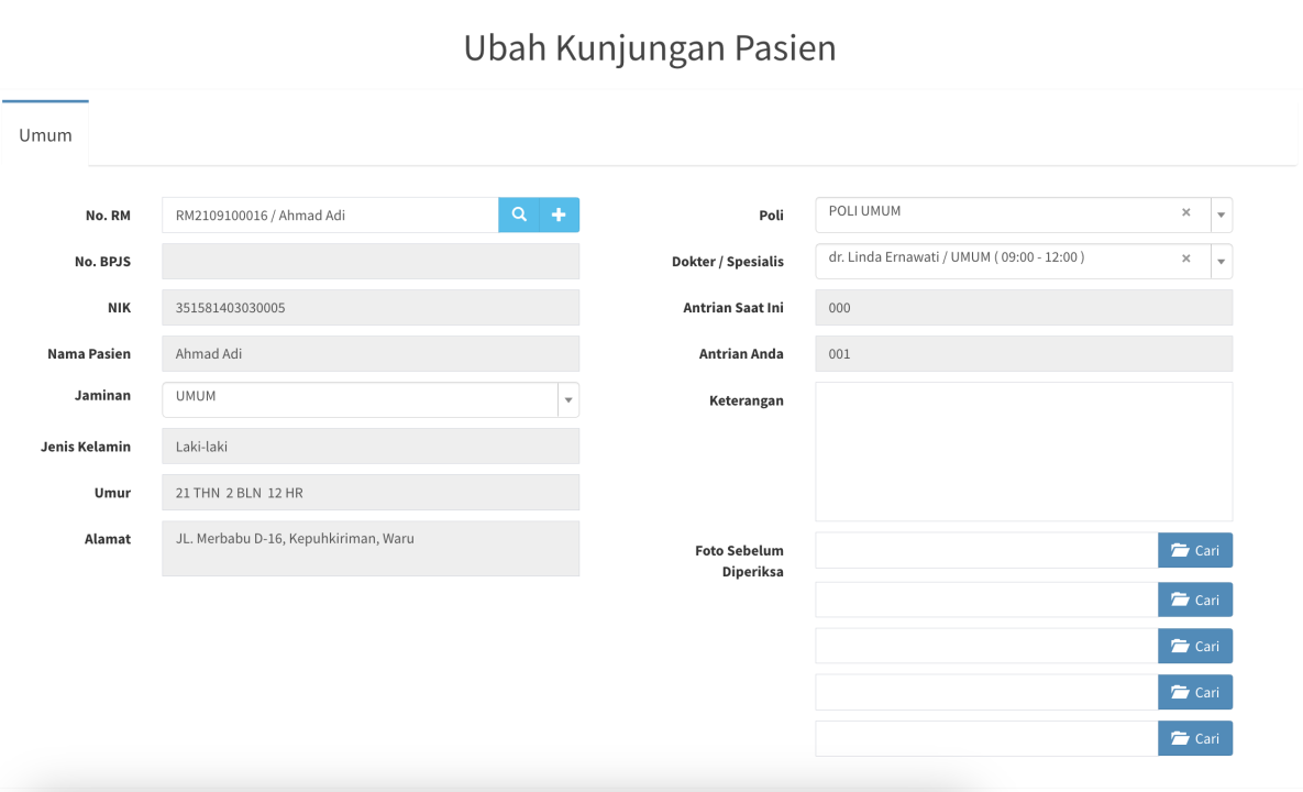 untuk memilih Pasiennya - No. BPJS, NIK, Nama Pasien, Jenis Kelamin, Umur, Alamat : Terisi Otomatis