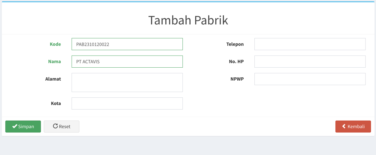 - Telepon : nomor telepon pabrik yang bisa dihubungi (Optional)
