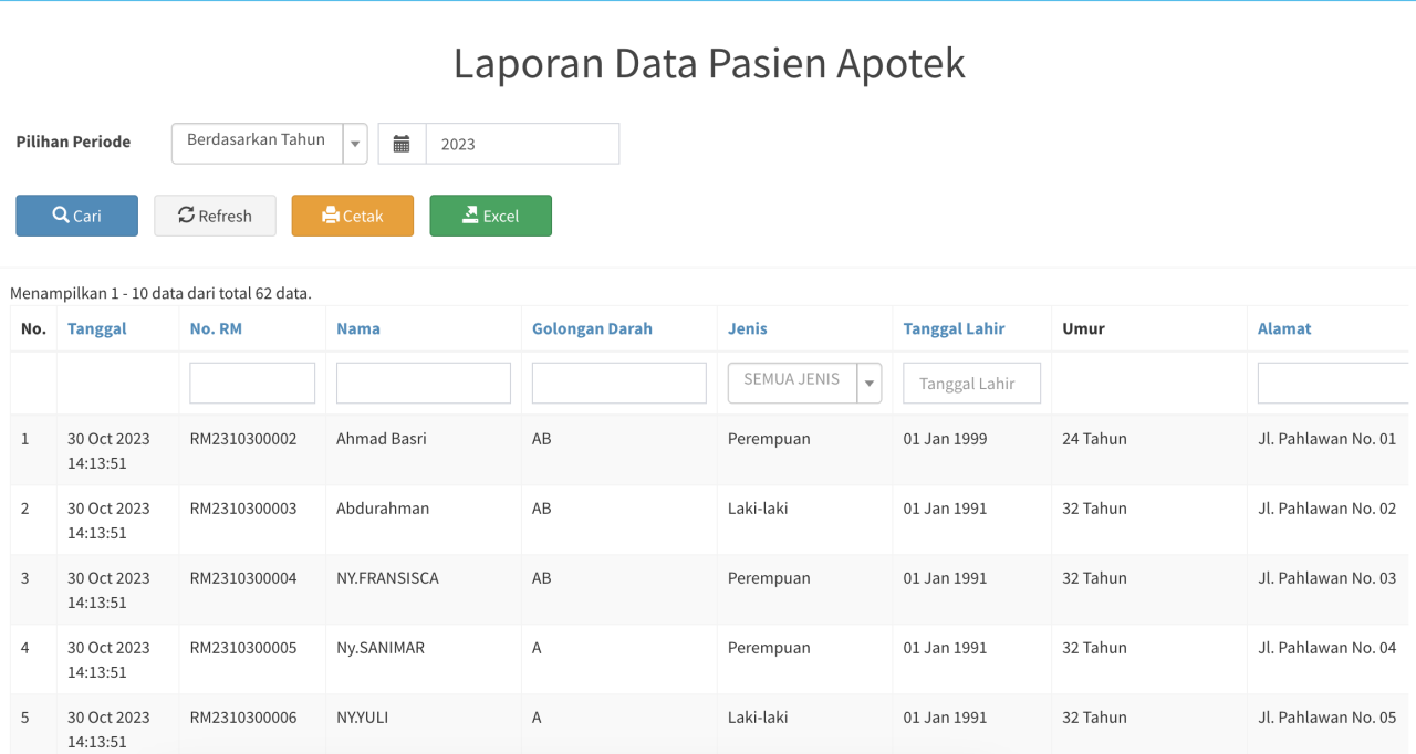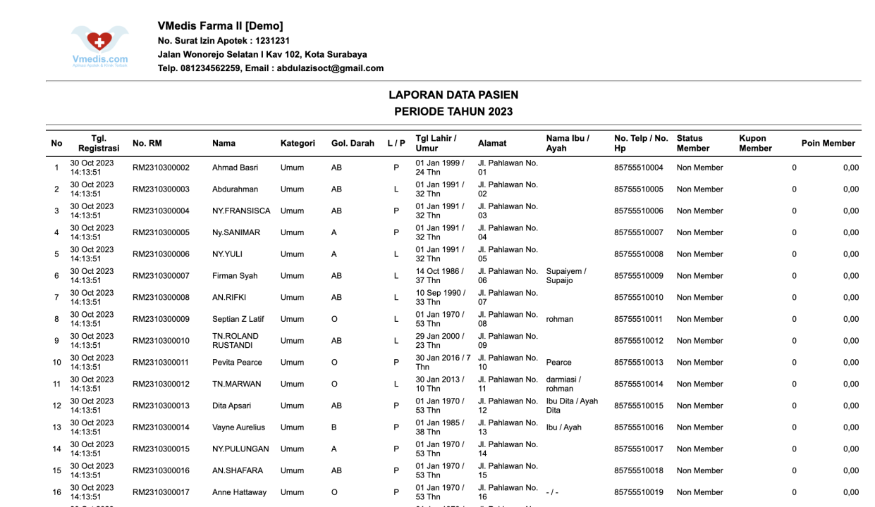 Laporan ini dapat anda gunakan untuk melihat data pasien yang sudah anda inputkan di menu Master Data Pasien. Anda bisa menarik datanya dengan mencetak atau mengexport laporannya.