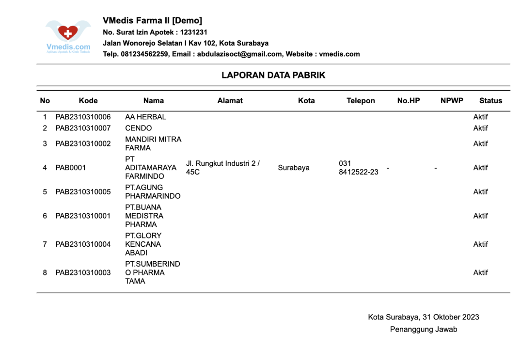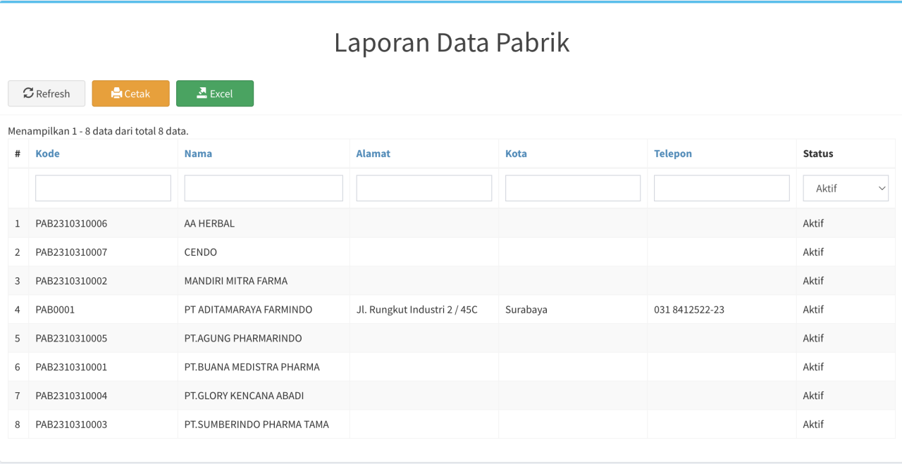 Laporan ini dapat anda gunakan untuk melihat data pabrik yang sudah anda inputkan di menu Master Data Pabrik. Anda bisa menarik datanya dengan mencetak atau mengexport laporannya.