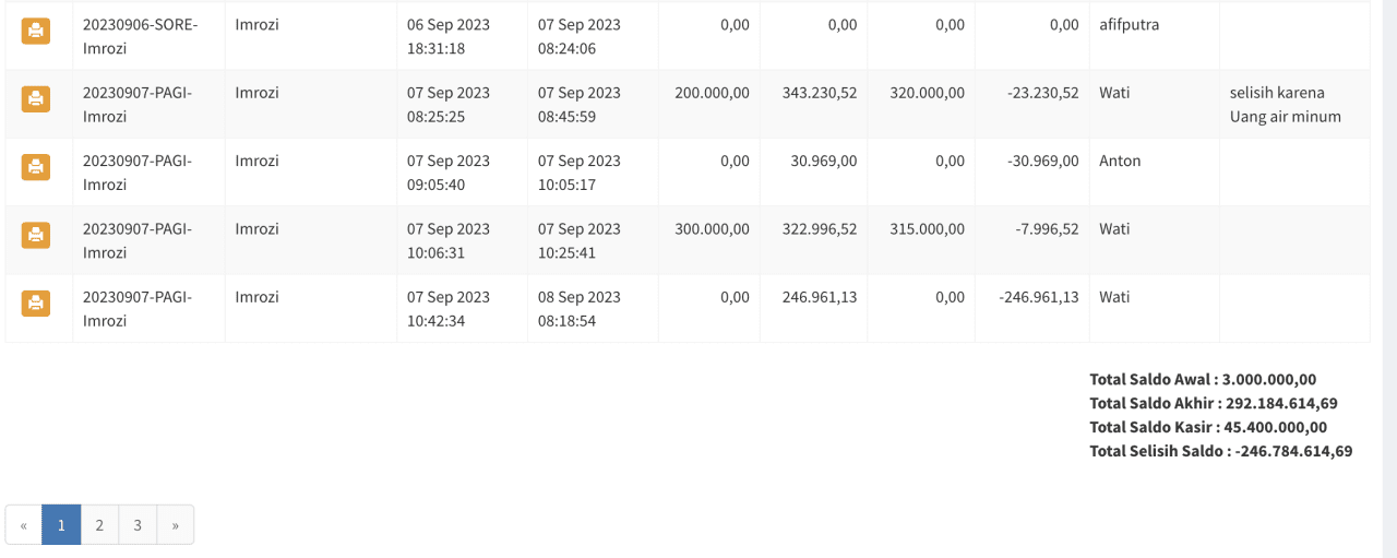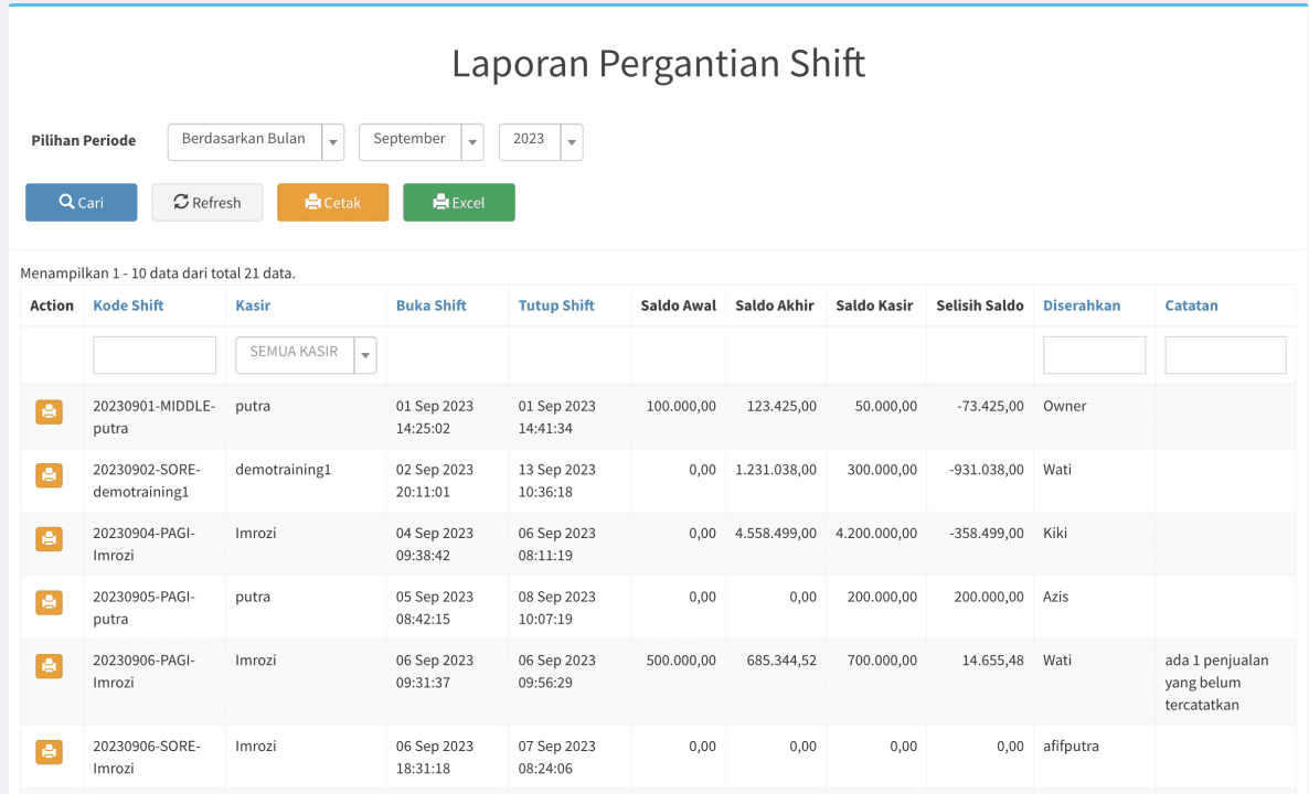 Laporan ini berisi riwayat pergantian shift yang telah dilakukan sesuai periode tertentu. Disini anda bisa tahu shift mana saja yang selisih dan apa alasannya. Anda juga bisa mencetak ulang laporan pergantian shiftnya.