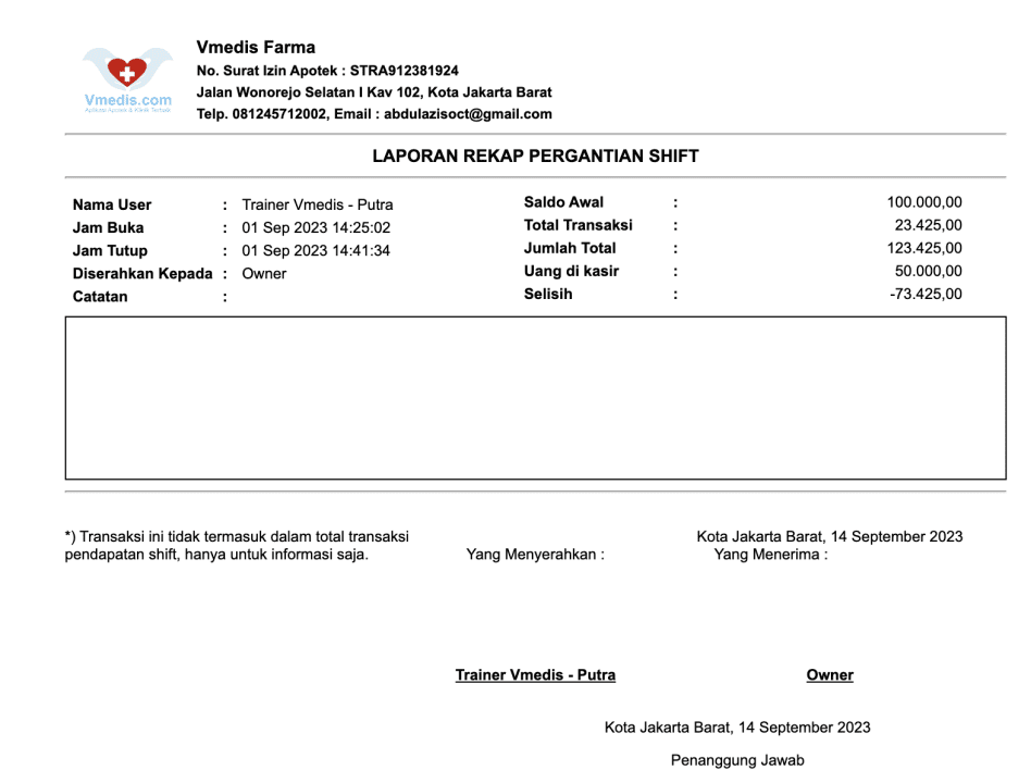 - Total Saldo Akhir : Jumlah saldo yang diinputkan saat user tutup Shift
