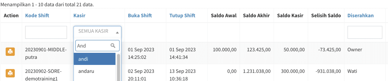 - Anda bisa mencari kasir tertentu dengan klik filter dibawah kolom Kasir