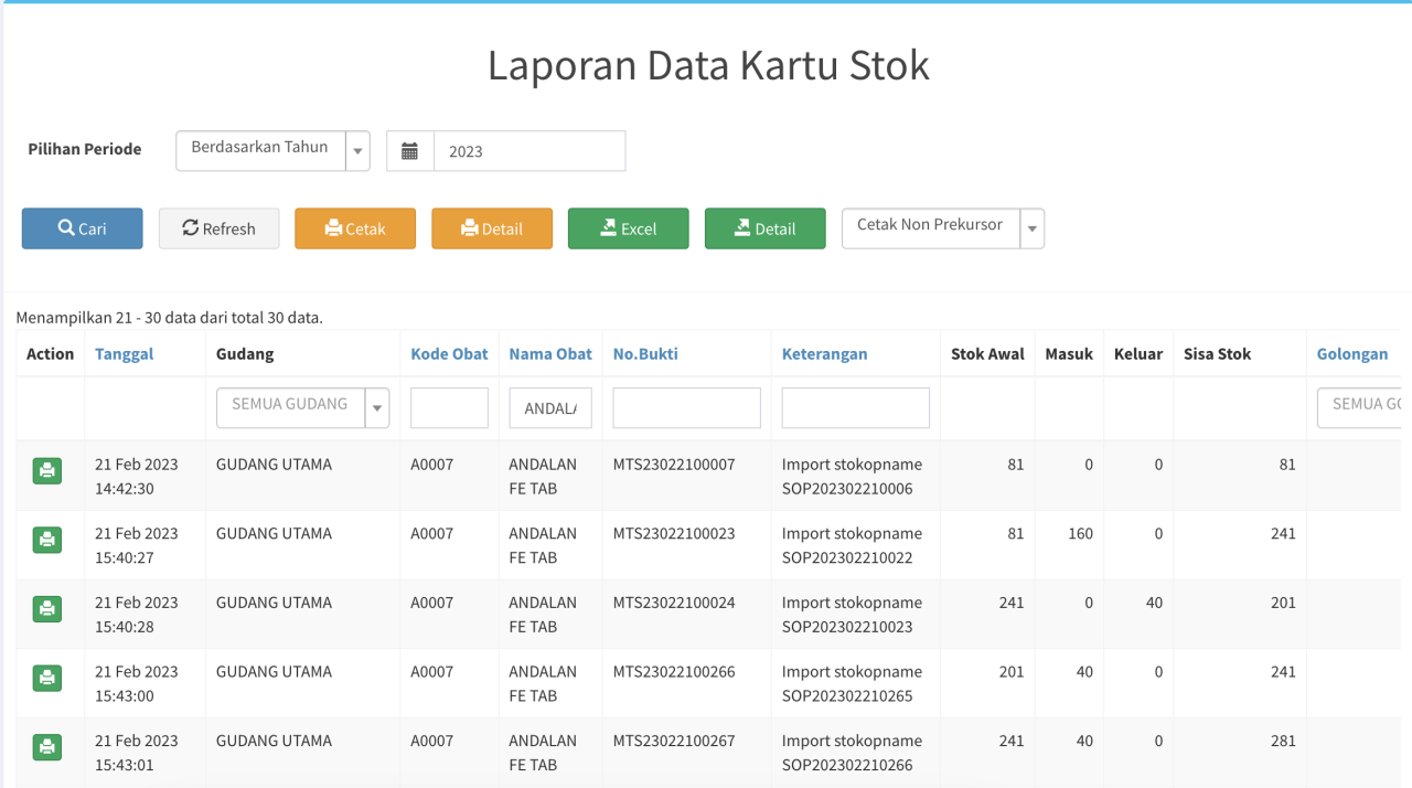 - Cetak Detail : Cetak detail kartu stok tiap obat