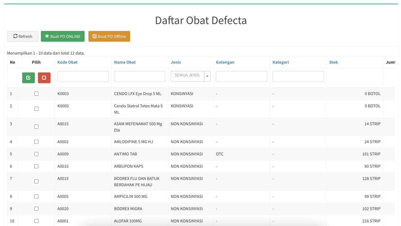 - Lalu untuk melihat obat-obat yang sudah masuk list obat defecta, klik tombol