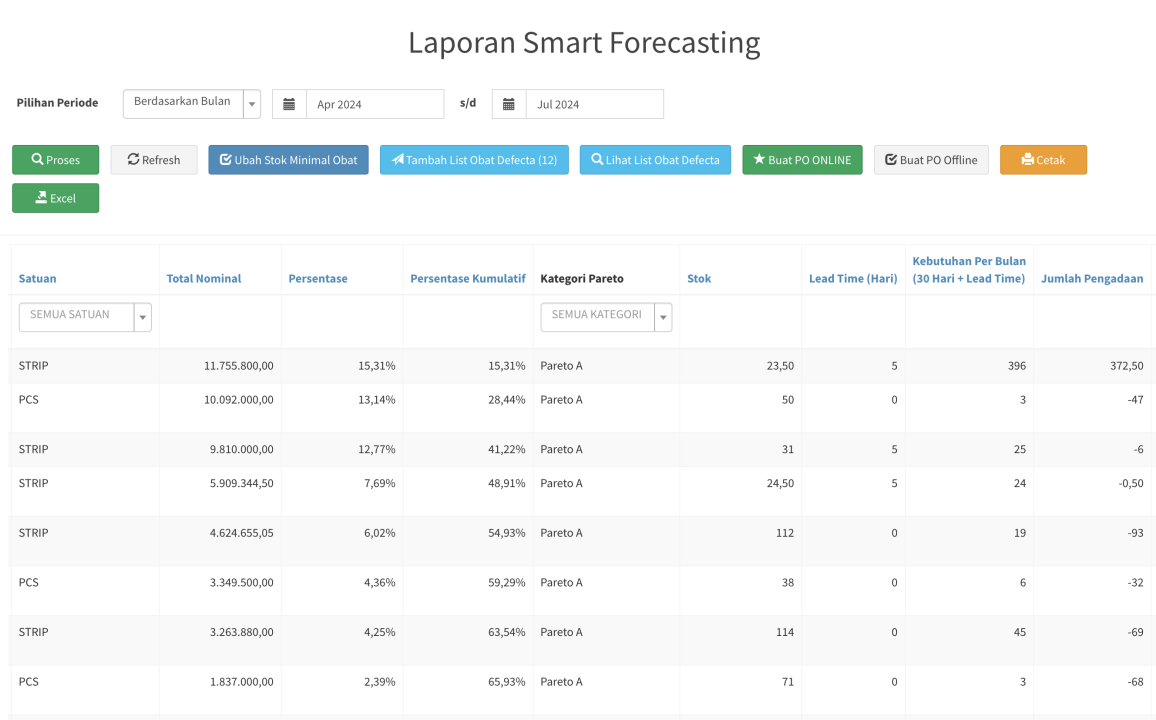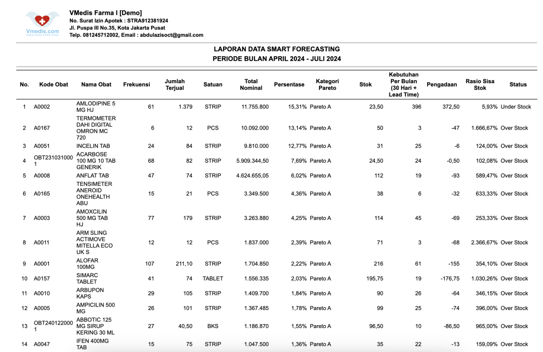 Menu ini berfungsi untuk menganalisa kebutuhan obat dan pareto obat. Dengan ini menu ini anda bisa tahu berapa kebutuhan obat-obat anda per bulan dan mana obat yang nyumbang omset paling besar. Sehingga anda bisa meningkatkan performa omset dan profit bisnis apotek anda.