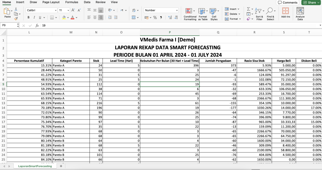 - Geser ke kanan tabelnya, untuk melihat Pareto dan Kebutuhan Obat Per Bulan