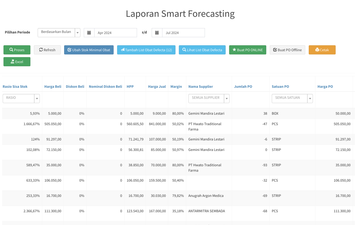 - Geser ke kanan tabelnya, untuk melihat rasio stok, detail harga obat dan jumlah PO