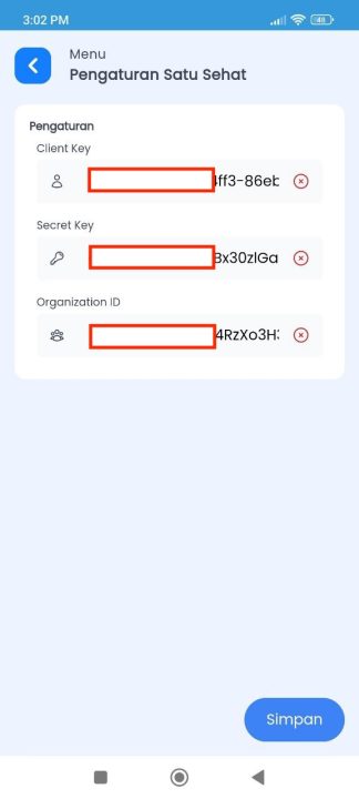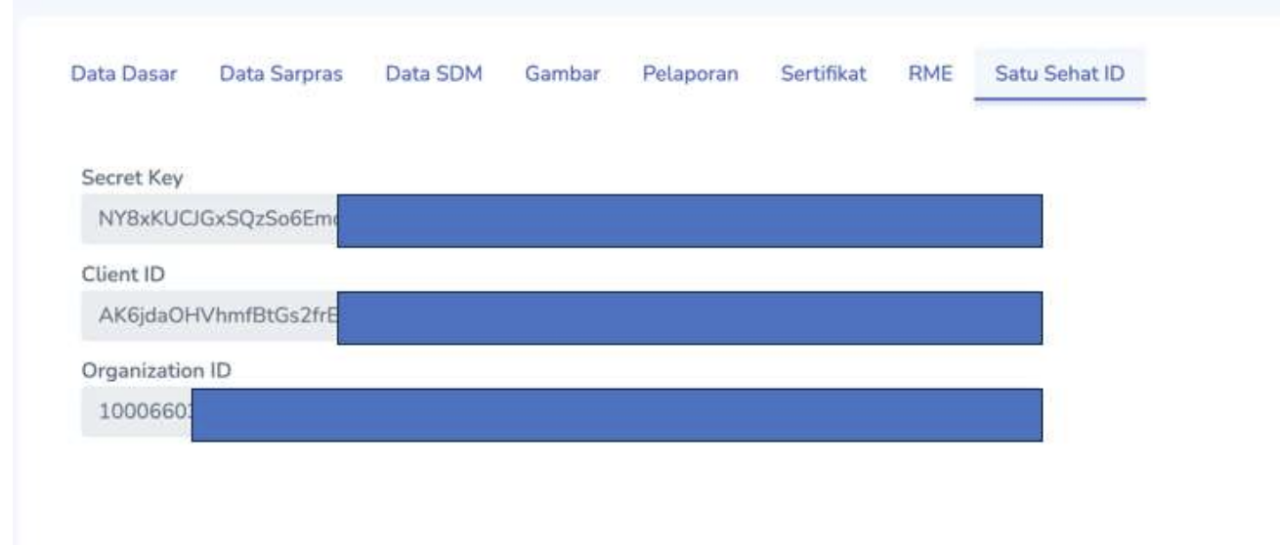 - Silahkan anda salin Organization id, Client Key dan Secret Key. Lalu tempel ke Form Pengaturan Satu Sehat Vmedis