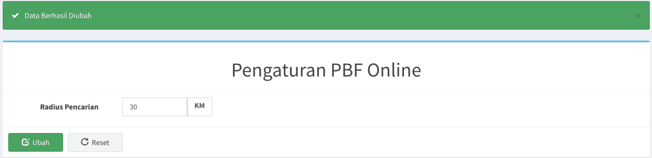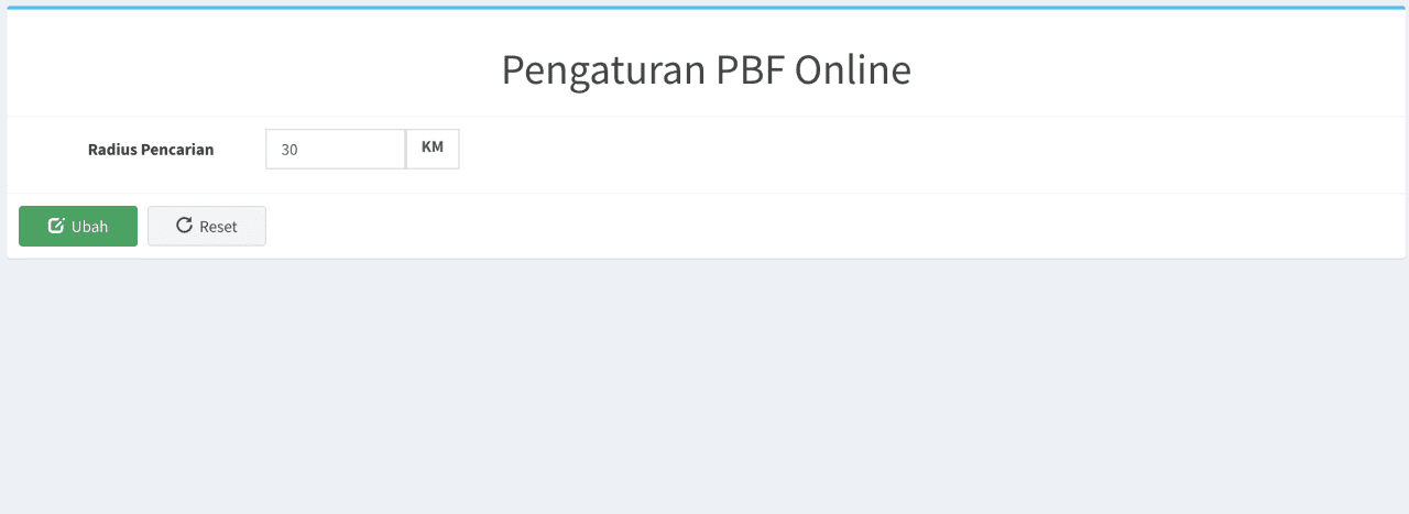 Menu ini digunakan untuk mengubah pengaturan default menu PBF Online. Disini anda dapat mengatur seberapa jauh PBF yang akan dimunculkan obatnya dalam pencarian anda.