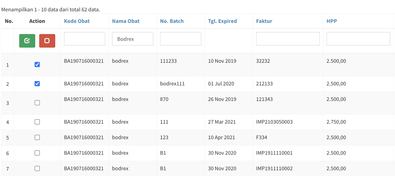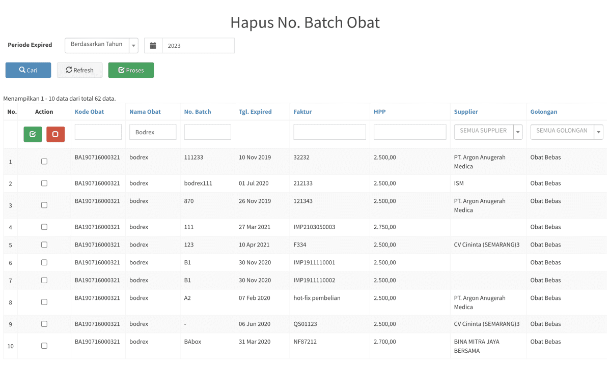 - Setelah itu anda cari nama obat yang mau dihapus batchnya