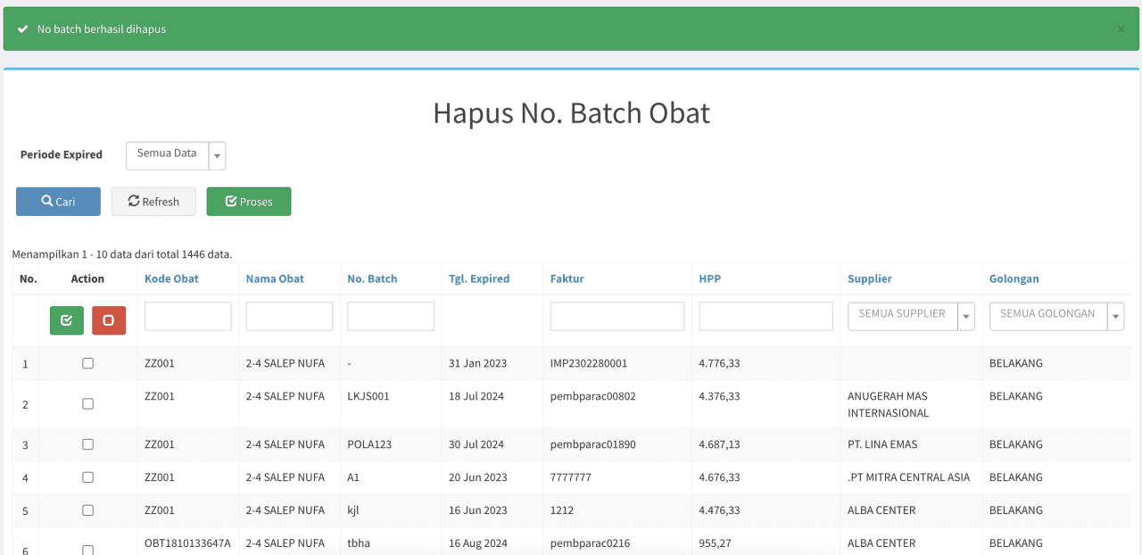 Menu ini dapat anda gunakan untuk menghapus no.batch obat yang sudah tidak terpakai. Sehingga no.batch tidak akan menumpuk.