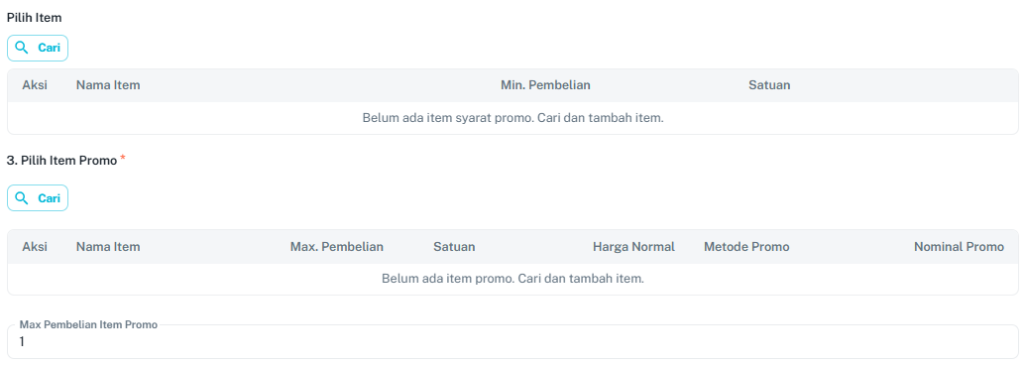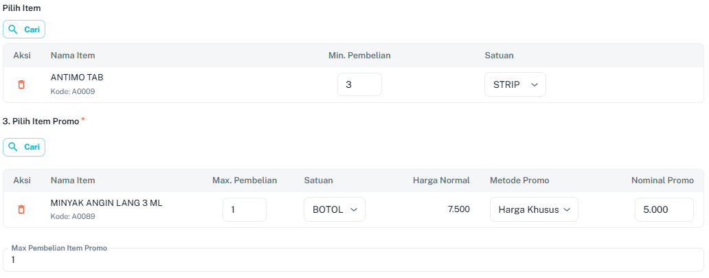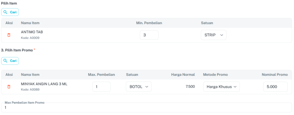 - Max Pembelian: Batasi jumlah item promo yang boleh diambil per transaksi.