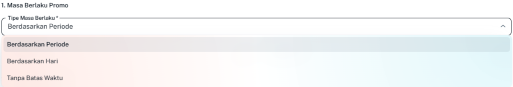 - Masa Berlaku: Pilih tipe masa berlaku berdasarkan Periode, Hari, atau Tanpa Batas Waktu.