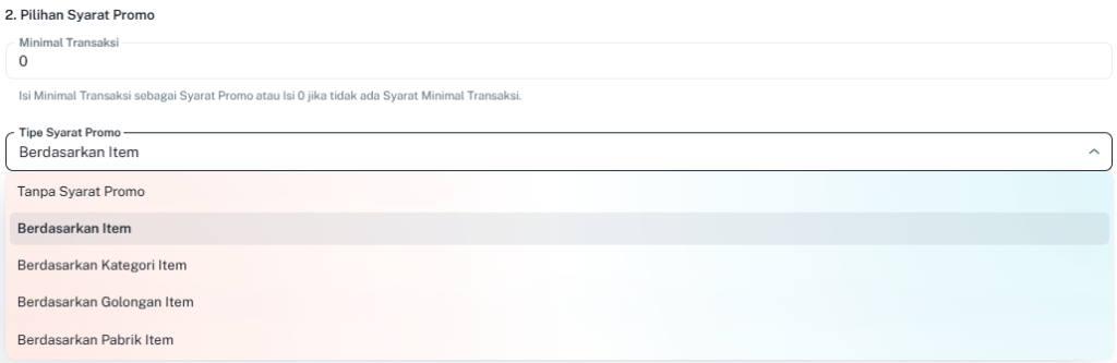 - Tipe Syarat: Pilih pemicu berdasarkan Item, Kategori, Golongan, atau Pabrik Item.