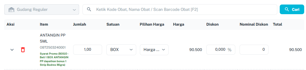 - Ketikkan nama obat atau scan barcode item yang menjadi syarat promo (Contoh: ANTANGIN PP 5ML).
