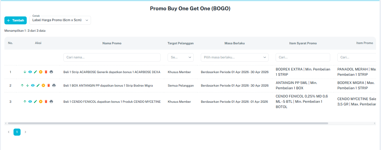 Fitur Promo BOGO (Buy 1 Get 1) memungkinkan Anda untuk memberikan produk bonus secara otomatis (gratis/Rp 0) ketika pelanggan membeli produk syarat yang telah ditentukan.