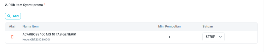 - Klik tombol Cari pada bagian Pilih Item Syarat Promo.