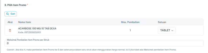 - Contoh Nama Promo: Masukkan nama kampanye, contoh: “Beli 1 Strip ACARBOSE dapat bonus 1 ACARBOSE DEXA”.