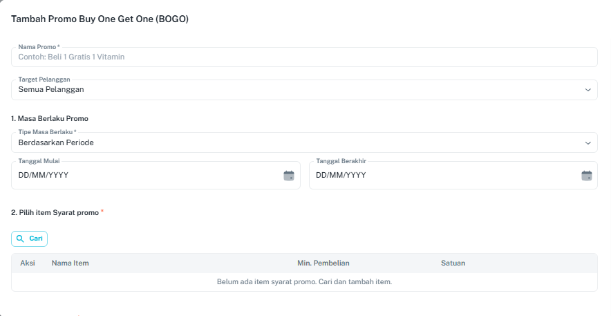 - Masa Berlaku Promo: Pilih tipe periode (Berdasarkan Periode, Hari, atau Tanpa Batas Waktu). Jika berdasarkan periode, tentukan tanggal mulai dan berakhirnya.