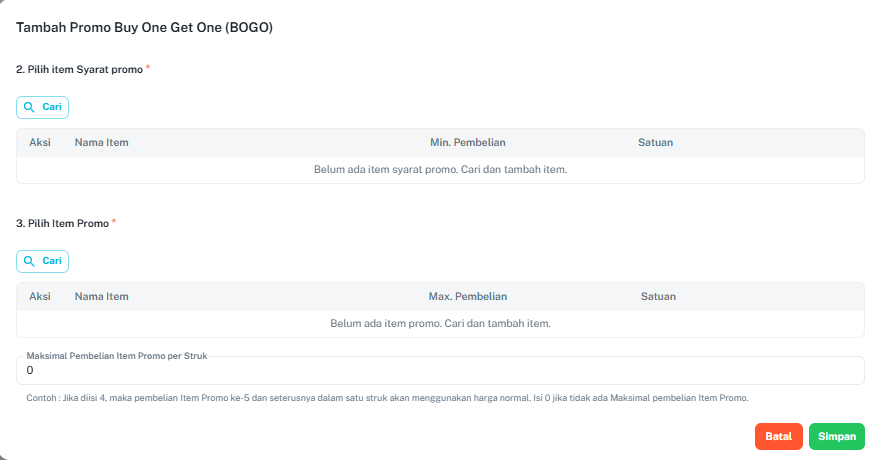 - Maksimal Pembelian per Struk: Gunakan kolom ini untuk membatasi jumlah pilihan bonus. Contoh: Jika ada 3 item promo namun kolom ini diisi 1, maka pelanggan hanya bisa memilih salah satu dari 3 item tersebut di kasir.