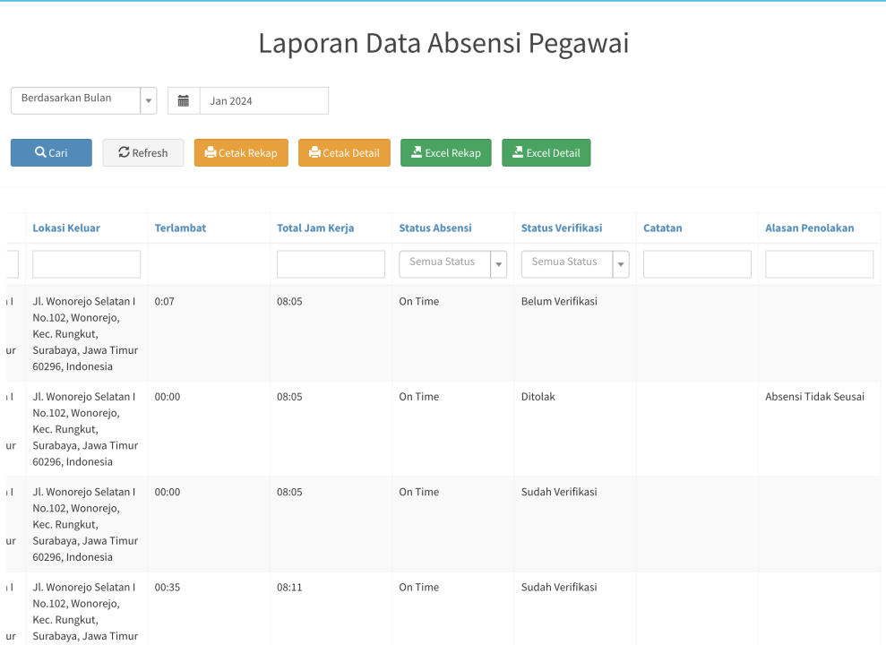 - Alasan Penolakan : alasan yang diinputkan oleh admin yang menolak absensi pegawai