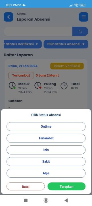 - Pilih Status Absensinya, lalu klik tombol Terapkan