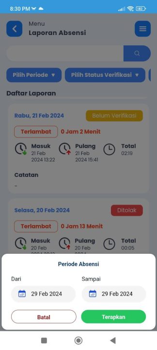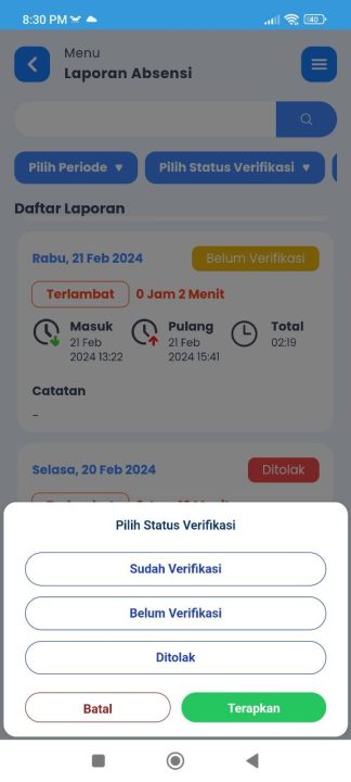 - Anda bisa memfilter laporan dengan 3 pilihan : Pilih Periode, Pilih Status Verifikasi, Pilih Status Absensi