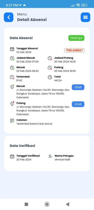 - Sudah Verifikasi : Status Absensi anda yang sudah diverifikasi Owner/Supervisor