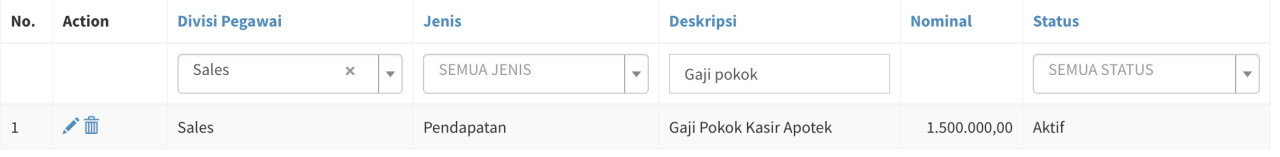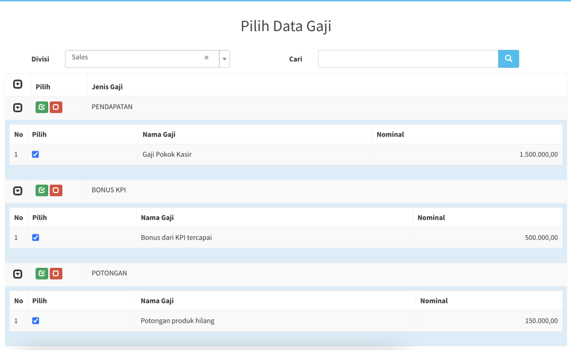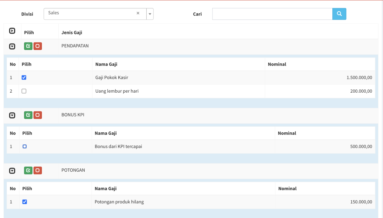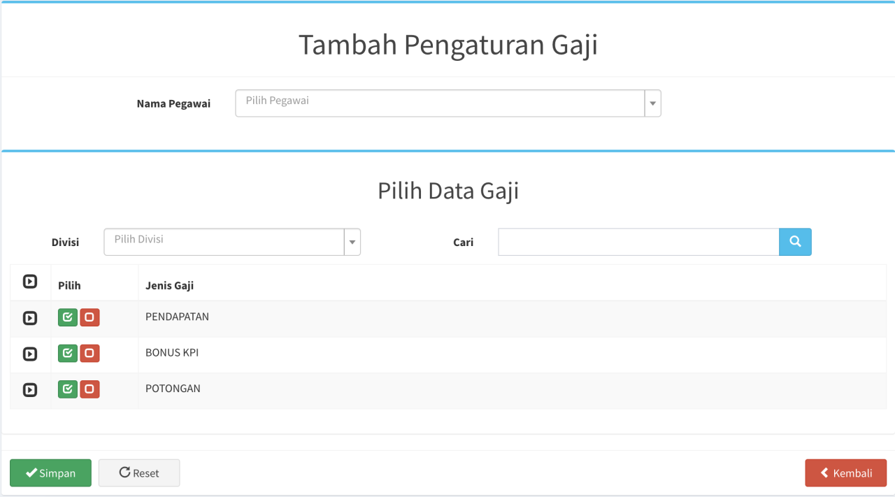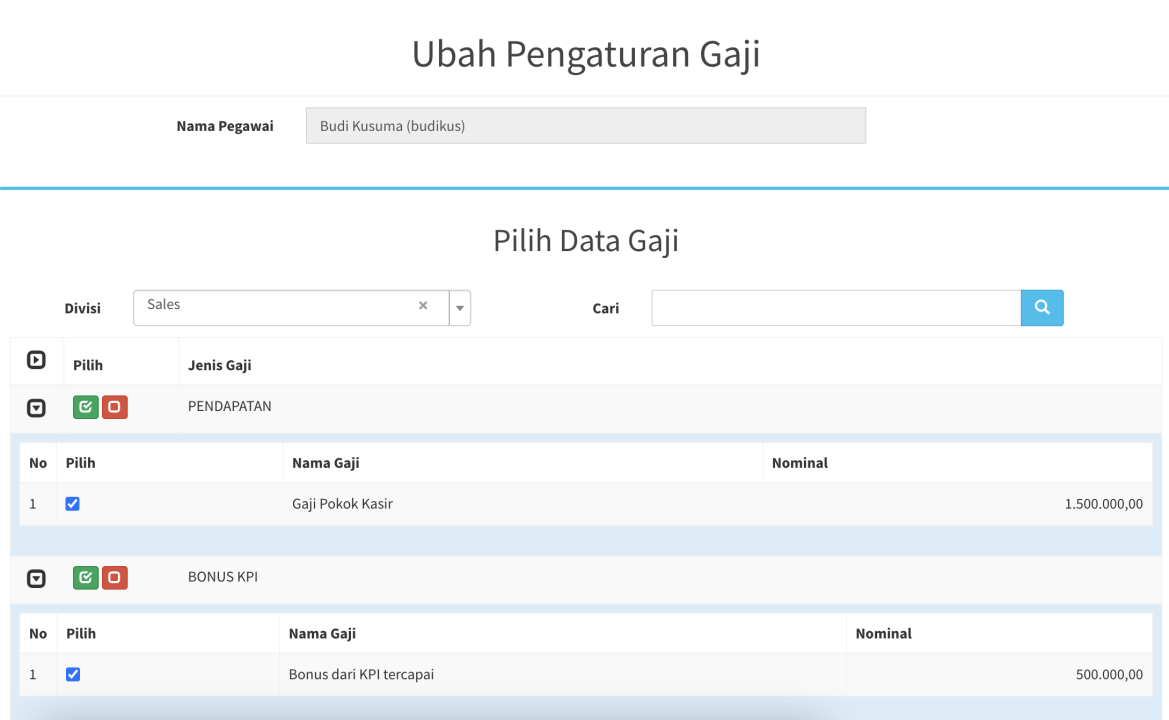 Menu ini berfungsi untuk mengatur gaji pegawai anda. Anda bisa memberikan gaji pendapatan, gaji pencapaian KPI ataupun potongan. Satu pegawai bisa mendapatkan gaji lebih dari 1 divisi.