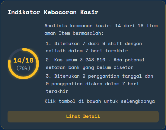 Indikator Kebocoran Kasir berfungsi untuk mengaudit aktivitas penjualan, selisih uang, dan setoran bank untuk mencegah fraud dan kelalaian operasional.