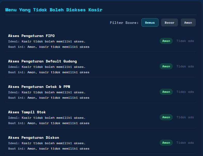 Bagian ini memastikan bahwa kasir tidak memiliki akses ke menu yang dapat mereka gunakan untuk mencocokkan data atau memanipulasi transaksi.