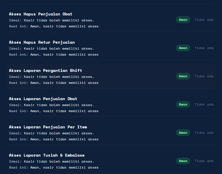 | Cek Pengaturan Tanpa Cetak | Status “Tidak Aktif” untuk semua user yang diaudit. | Aman. Fitur ini (misalnya promo “pelanggan tanpa cetak, maka gratis”) tidak disalahgunakan. |