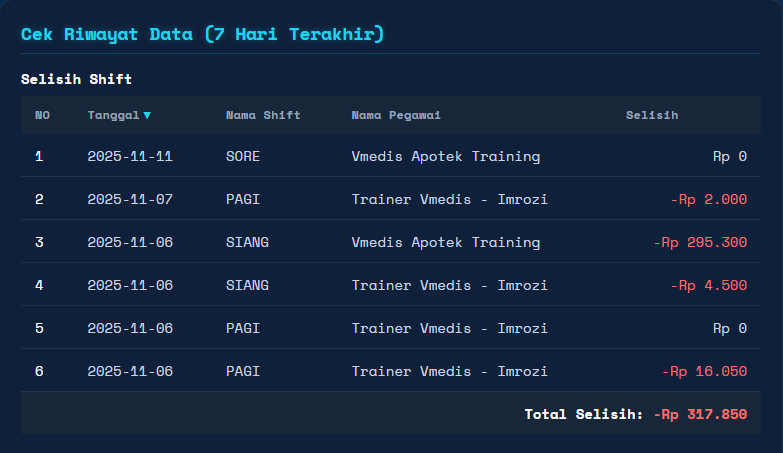 | Selisih Shift | Ditemukan 4 dari 6 shift dengan selisih. Total selisih: Rp -317.860. | Klarifikasi Segera: Panggil pegawai yang bertugas pada shift dengan selisih (terutama yang minus besar atau yang nol). Selisih Nol perlu diwaspadai jika ada potensi pencocokan data. |