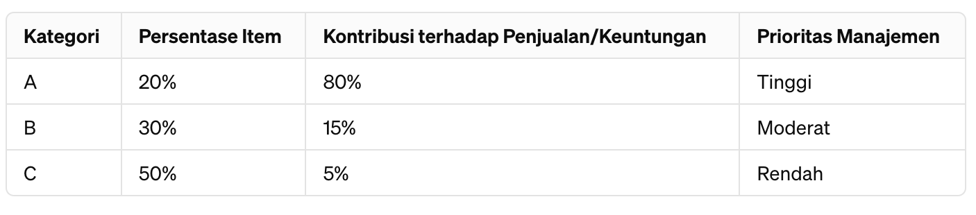 Salah satu metode yang telah terbukti efektif dalam mengoptimalkan manajemen persediaan adalah penerapan prinsip Pareto ABC.