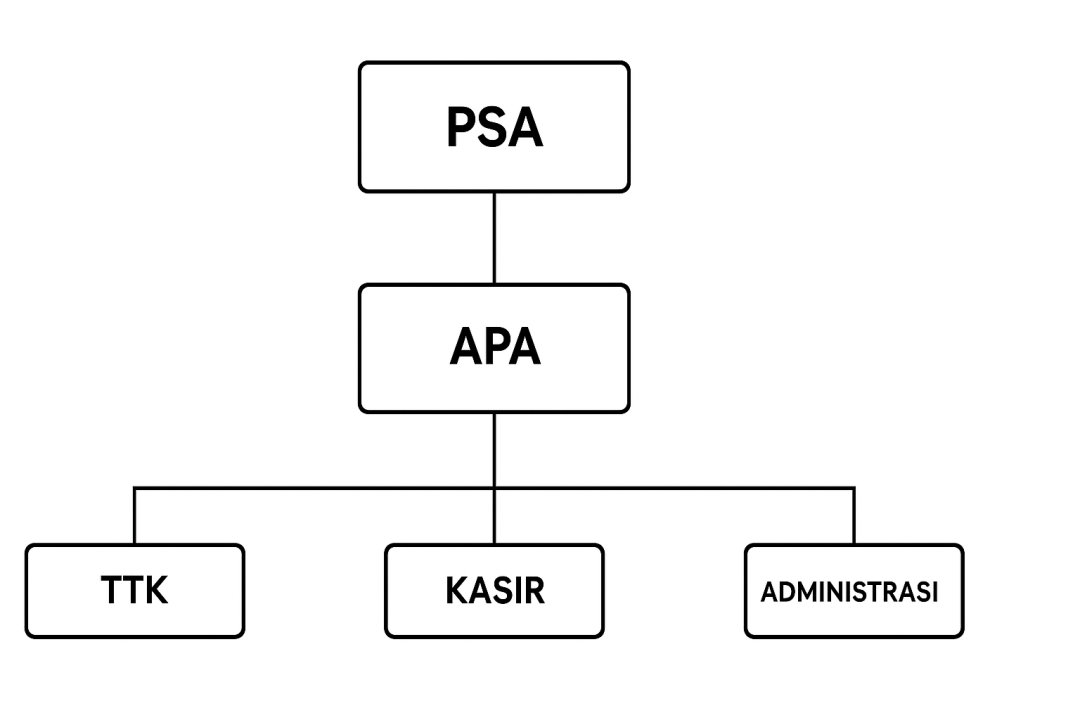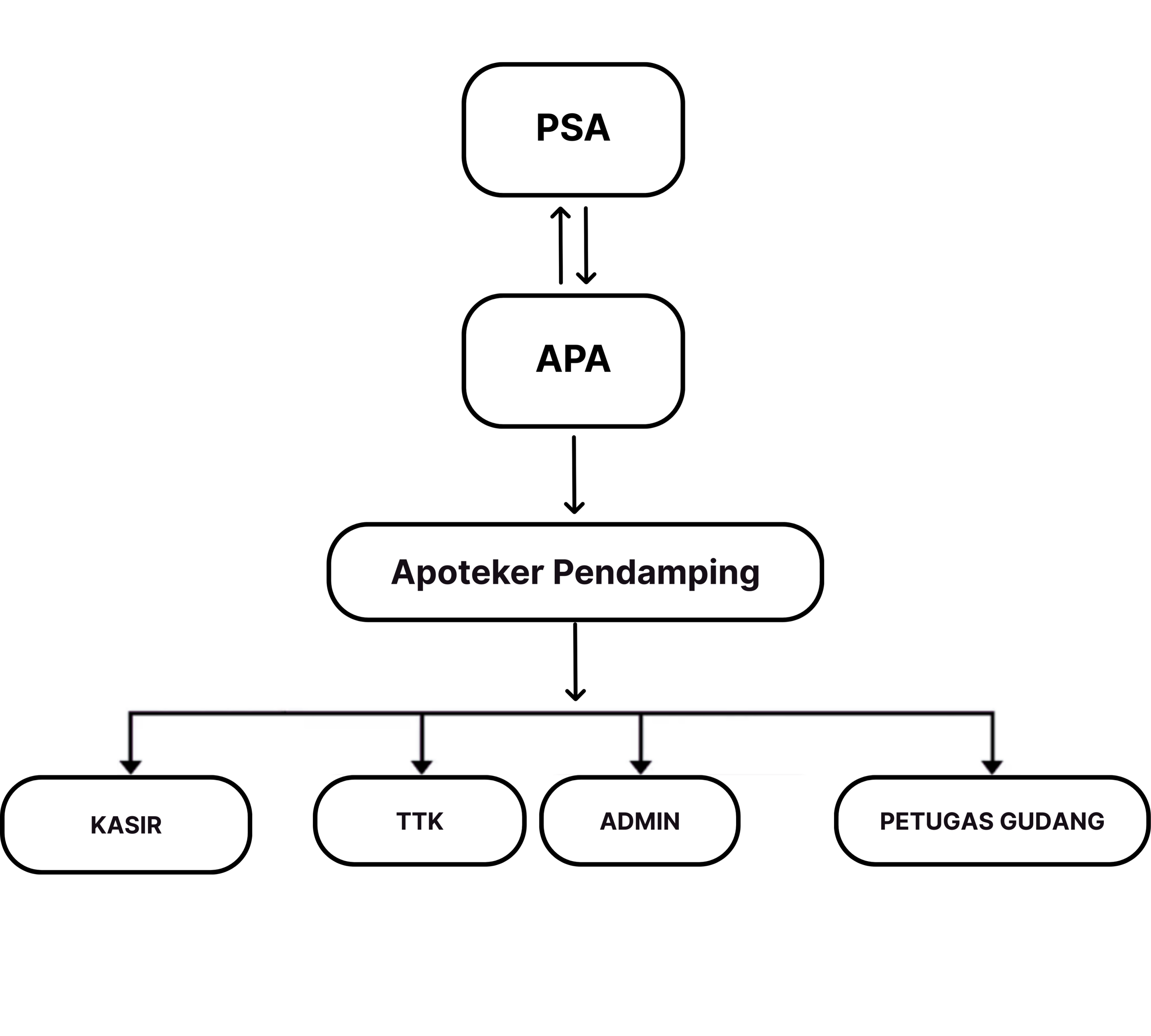 Struktur ini ideal untuk apotek skala kecil dengan tim terbatas. PSA sebagai pemilik menunjuk satu APA sebagai penanggung jawab operasional. Di bawah APA terdapat TTK, kasir, dan staf administrasi. Beberapa peran bisa dirangkap sesuai kebutuhan, namun tetap harus mematuhi batasan profesi dan regulasi kefarmasian.